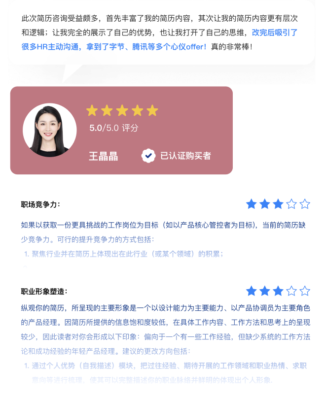 此次简历咨询受益颇多,首先丰富了我的简历内容,其次让我的简历内容更有层次和逻辑;让我完全的展示了自己的优势,也让我打开了自己的思维,改完后吸引了很多HR主动沟通,真的非常棒!
